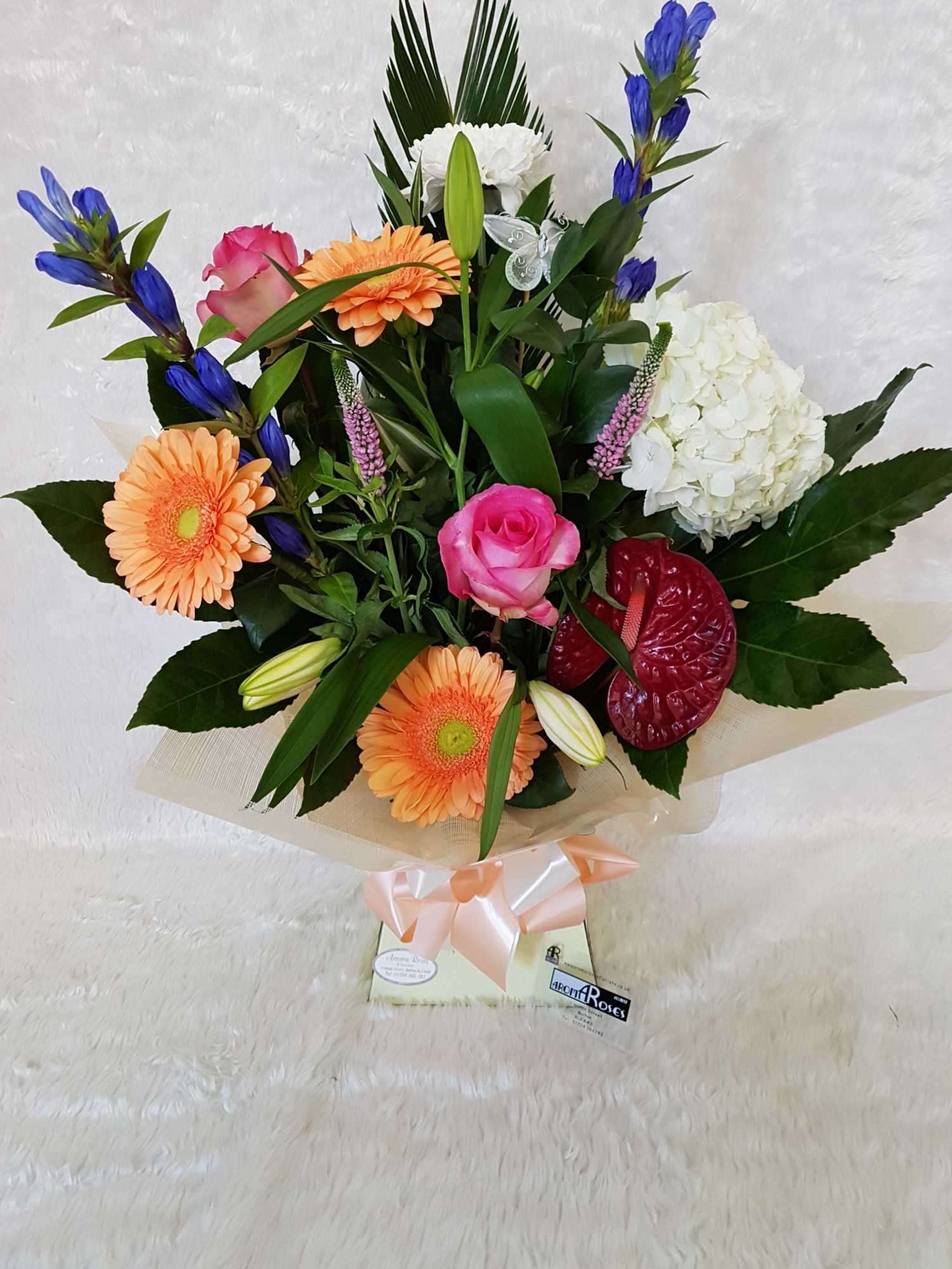 A colourful mix of seasonal flowers combining vibrant lime greens and yellows with vivid pinks and blues to brighten up any day.