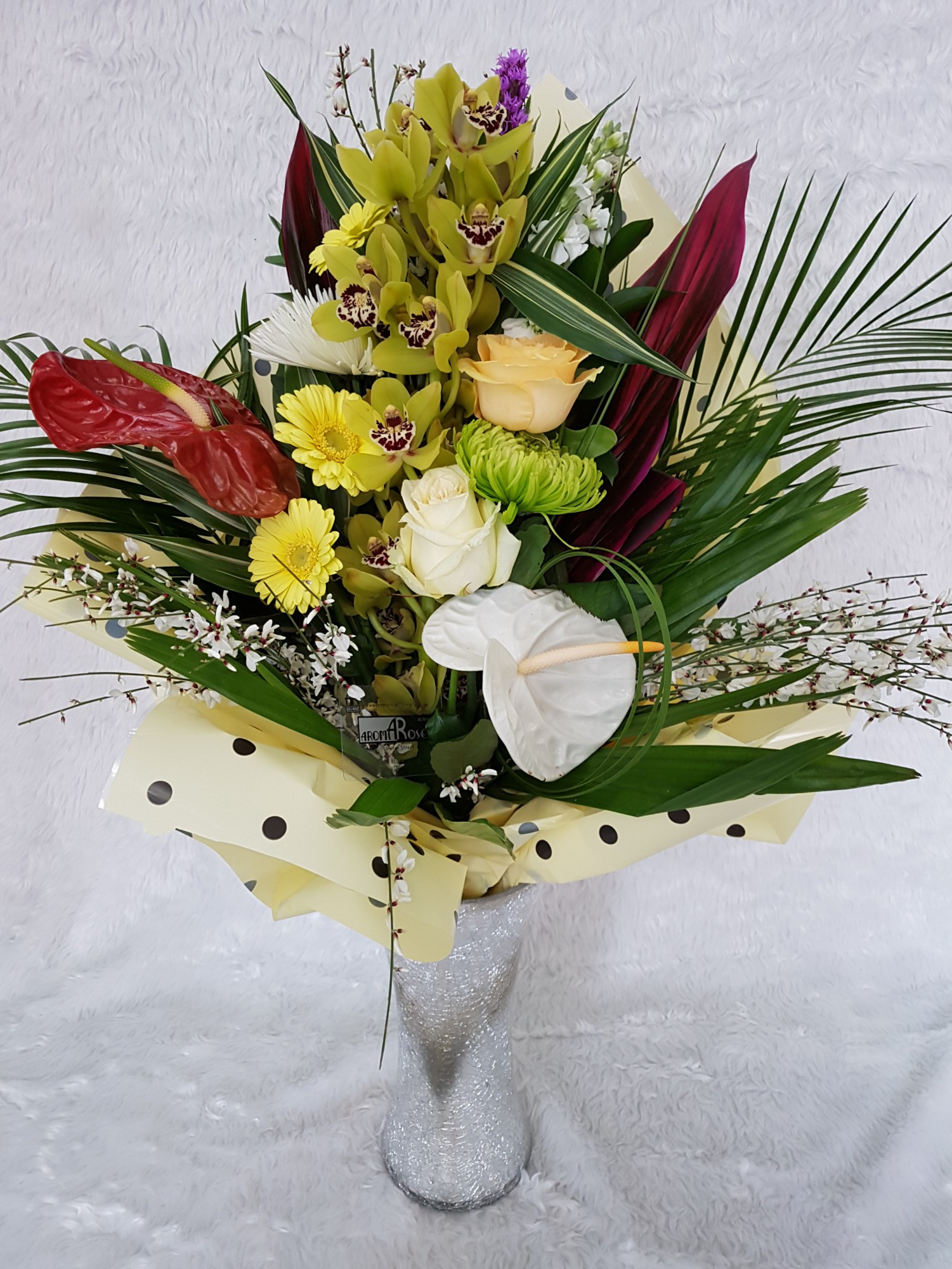 A sumptuous grouped handtied bouquet of rich red Carnations finished with lush green foliage.