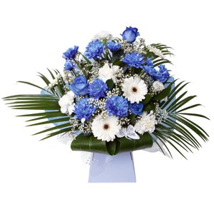 A stylish arrangement to welcome a new arrival, crisp whites and subtle blues, edged with lush Aspidistra and Fern foliage.