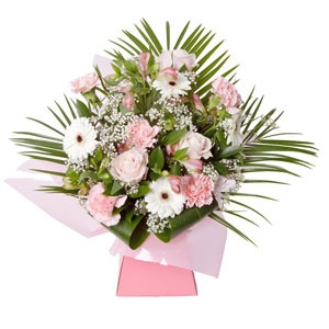 A stylish arrangement in crisp whites and subtle pinks to welcome a new arrival.