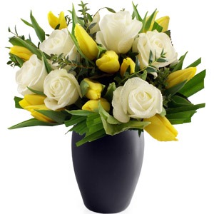 A striking combination of white Roses with masses of yellow Tulips, finished with a selection of fragrant Eucalyptus framed with Palm Leaf.