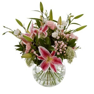 A fragrant arrangement of lovely pink Oriental Lillies and Roses, pretty Lisianthus and Bouvardia, finished with delicate Gypsophilia.