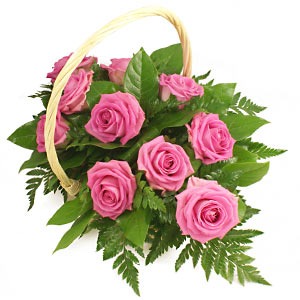Opulent pink Roses carefully arranged with complementing foliage in a traditional style basket.