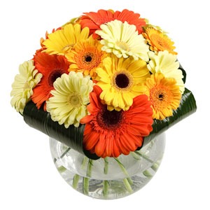 A modern and creative bouquet of stunning vibrant Gerbera set on dark rich folded Aspidistra foliage.