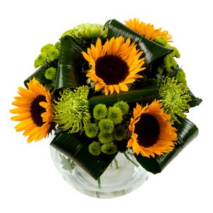 A striking bouquet including Sunflowers and lime green Shamrock and Kermit Blooms complemented with Aspidistra foliage.